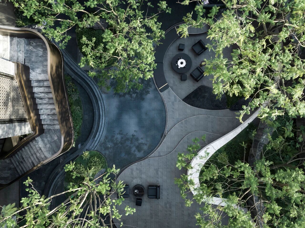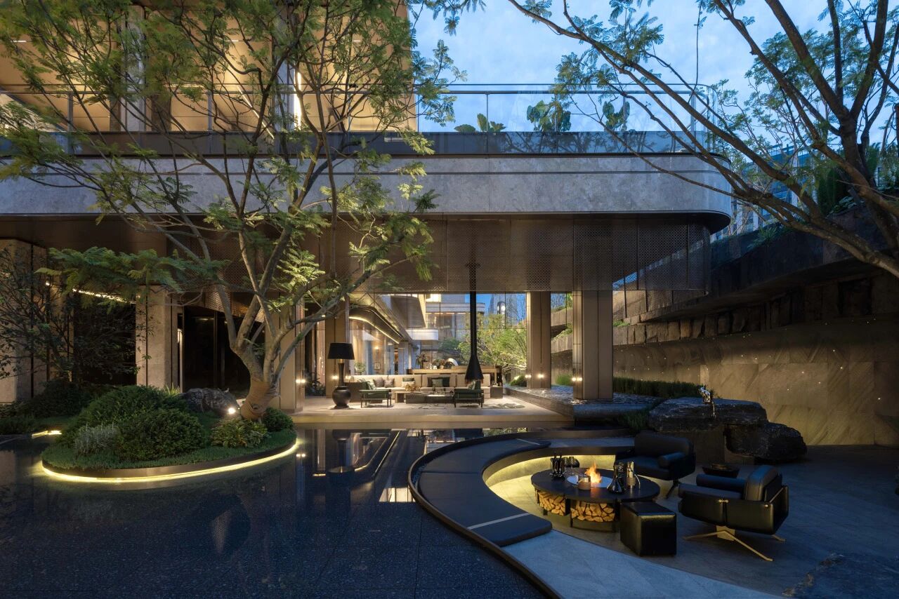把实景功能体验融于自然,将地下边庭空间拆解为多个立体的庭院花园,既可通过地面快速归家,也可以体验立体串联的景观空间;既可以拥有会所精致生活,又可以追求峡谷山野自然。峡谷上方植物选择的都是斜侧生长的,不遮挡视线,也让天光完美的落入地下庭院。
